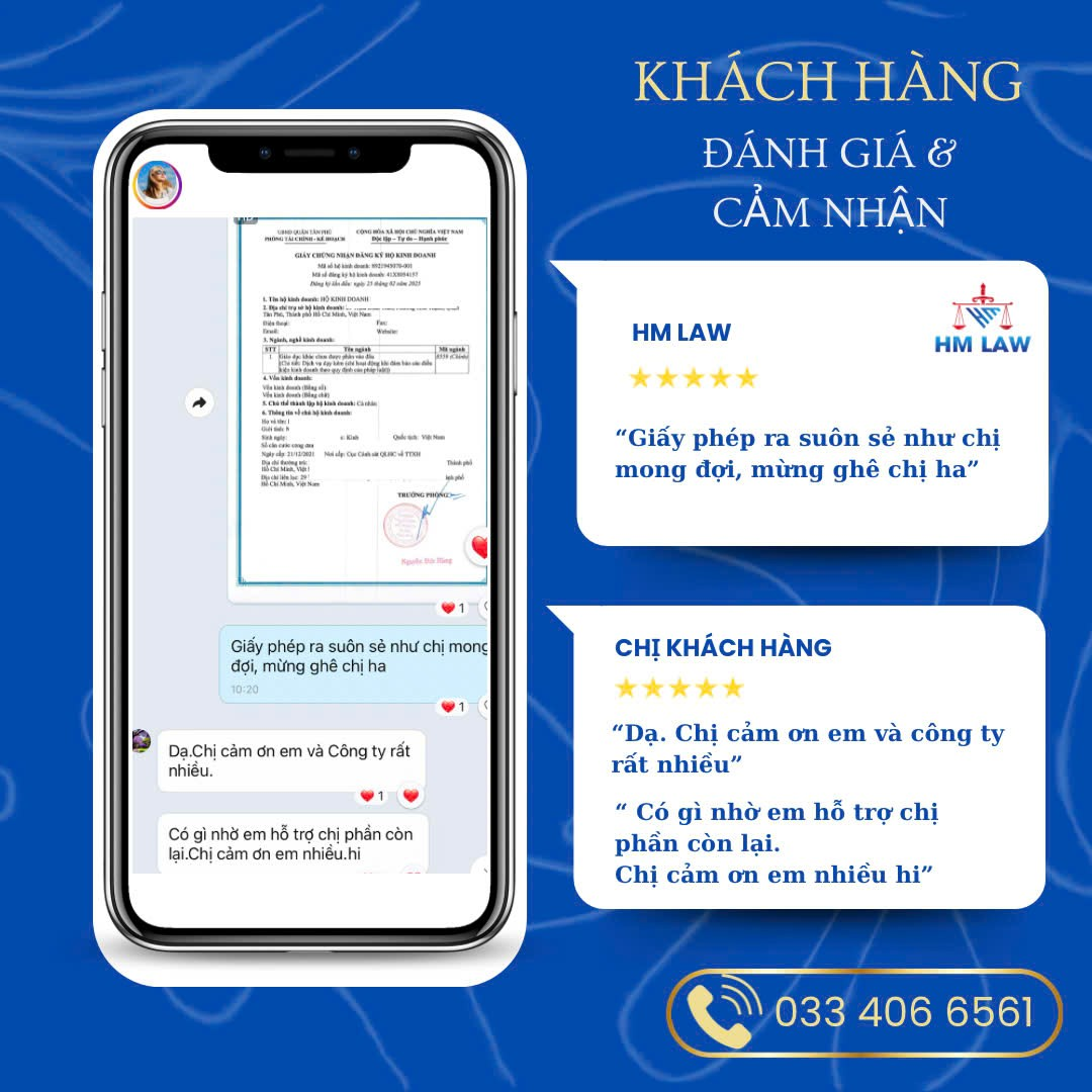 - “Chị T tại quận Tân Phú chia sẻ – Chị cảm ơn em và HM Law rất nhiều (vì đã ra giấy phép nhanh và đúng hẹn), phần còn lại nhờ em hỗ trợ chị.”